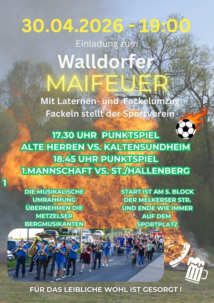 Wie in jedem Jahr findet am letzten Tag im April das bekannte Maifeuer auf dem Walldorfer Sportplatz statt. In diesem Jahr gibt es außerdem noch zwei Fußballspiele zu sehen. Genaueres im beiliegendem Flyer…